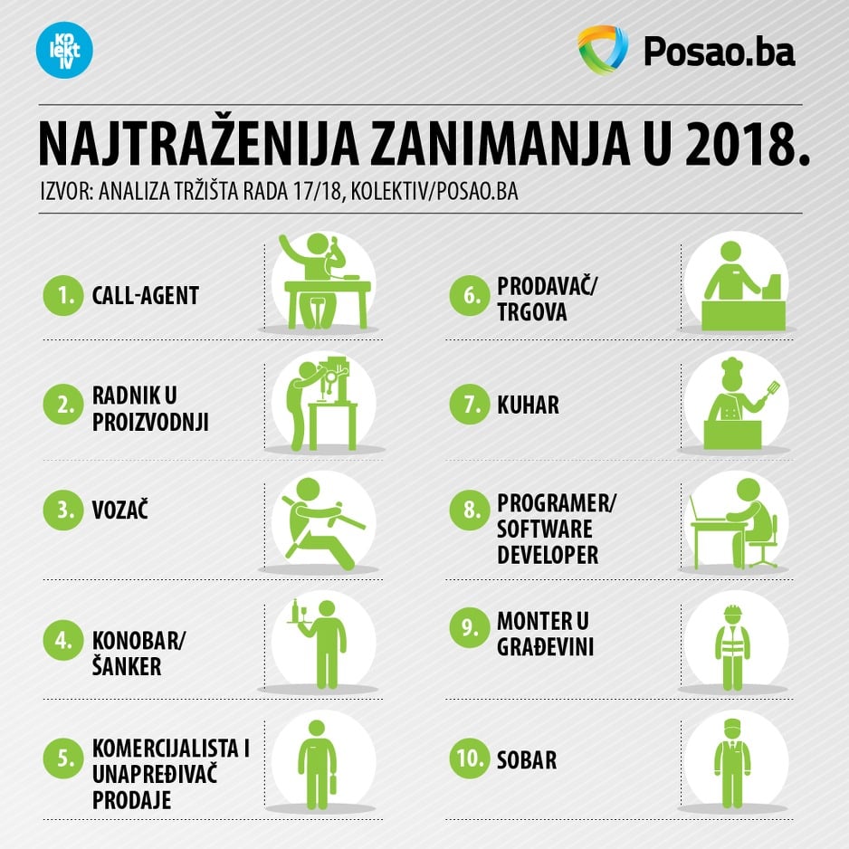 Prema potražnji, kao i u prethodnim godinama, prva mjesta su rezervisana za prodajna zanimanja, potom slijedi sektor ugostiteljstva a na šestom mjestu je zanimanje programer/software developer. U 2016. je vladao trend u potražnji za online saradnicima kao i stjuardima/stjuardesama, što u 2017. u top 10 najtraženijih zanimanja nije slučaj.